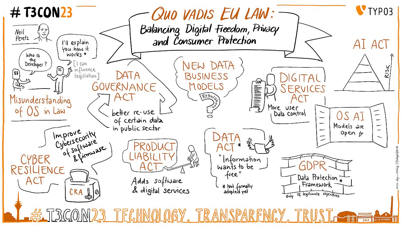 Editor’s Note: In July 2023,TYPO3 and fellow open-source CMS projects warned of the adverse effects of the Act in an Open Letter to EU legislators. The projects have also participated in meetings with other open-source projects, hosted by Open Forum Europe (OFE), to discuss the proposed legislation. Detailed input and recommendations have been offered to the EU, and since T3CON23 some major improvements have been made to the drafts. Though positive, this highlights the need for vigilance and participation by open-source projects in the development of new legislation.