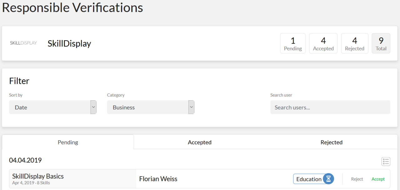 SkillDisplay is currently adapting the verifier view to my.skilldisplay.eu. Next steps will be completing all the functionality and usability tests in addition. The following screenshots show how the overview currently looks like.