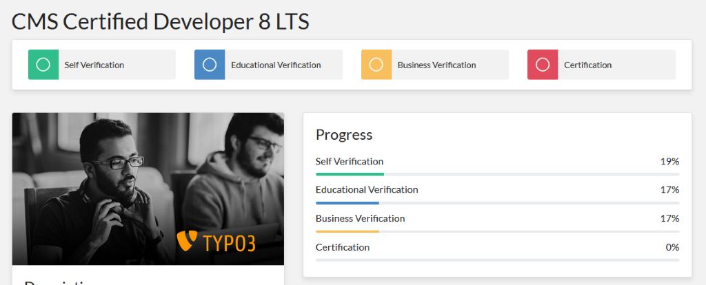 Educational Verification (blue): Employees can participate in a training (e.g.: offered by the TYPO3 trainer network) or assess their skills with online self-tests (e.g.: https://www.xbukku.com/). Successful application of skills will grant educational verification and be listed on the employees’ profile.