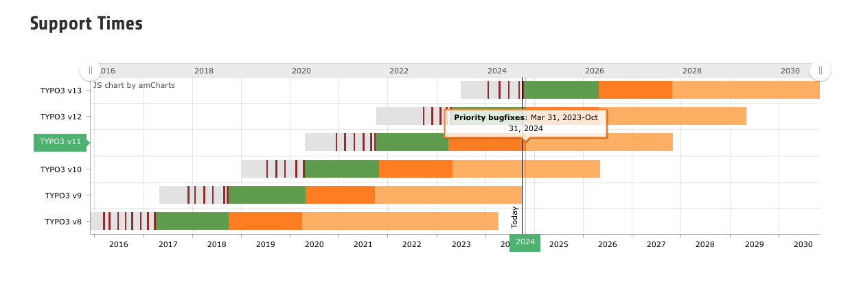 Visit my.typo3.org to purchase your ELTS package already during the presale period. By acting now, you ensure your TYPO3 v11 installation will stay protected beyond the free support period ending on 31 October 2024, allowing your team to plan for the future without rush.