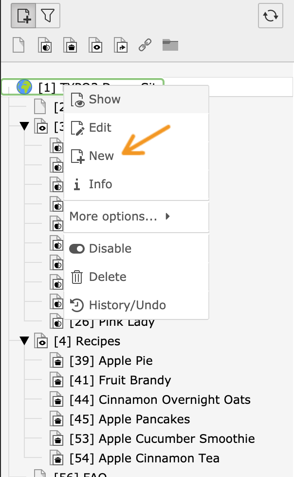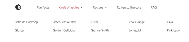 By default, TYPO3 will generate automatic navigation from your Page Tree structure. If you have a header menu on your website, the menu items will be the top-level landing pages. If a parent page has child pages, those child pages will be nested under the landing page (as with the “Kinds of apples” subpages below).