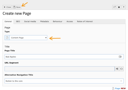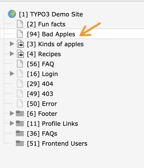 Once you’ve named your new page it will appear in the Page Tree. In the example below, I’ve added a page called “Bad Apples”.