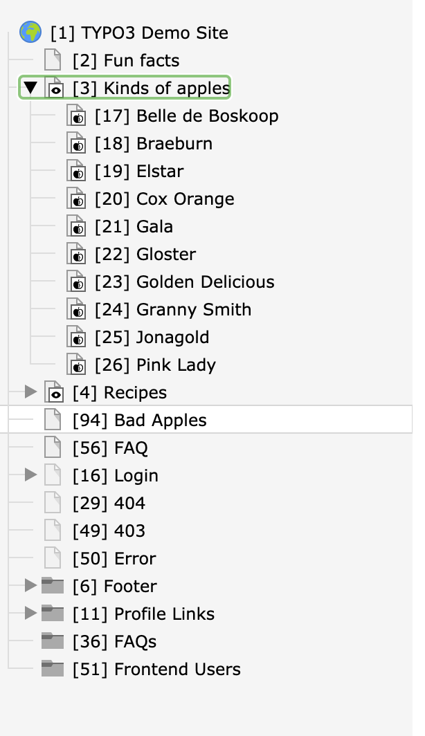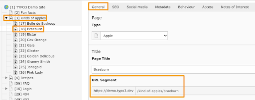 TYPO3 also generates automatic slugs based on page and subpage titles. (Slugs are the segment of the URL that identifies which page you’re on, i.e., the “community” typo3.org/community). In the example below, the page “Braeburn” is a subpage of “Kinds of apples” and so the automatically generated slug follows the format: root_address/landing_page_title/subpage_title.