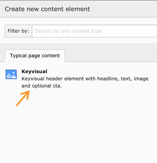 To try it out, visit the demo site’s backend and add a custom content element to the webpage by clicking on the “+ Content” button and selecting the “Keyvisual” content element from the popup menu.