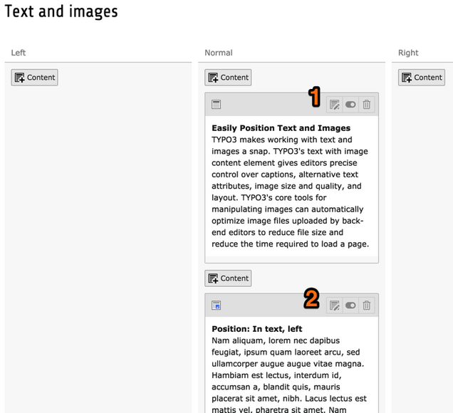 Content management isn’t always about publishing, it’s also be about being able to move, remove or change content when necessary. Content elements are one of the key components of TYPO3’s flexibility. You can create as many as you need on every page and arrange them as you like. They’re a bit like index cards that you can shuffle around by drag and drop, organize, reorganize and even size in different ways.