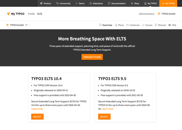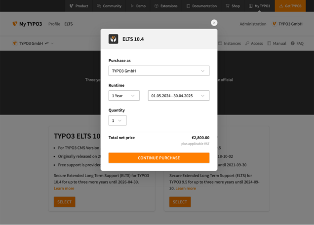 From now on, you will be redirected from typo3.com to my.typo3.org when purchasing any ELTS service, instead of shop.typo3.com. This move allows you to complete your entire purchase process within the centralized My TYPO3 platform, ensuring a smoother, more integrated experience.