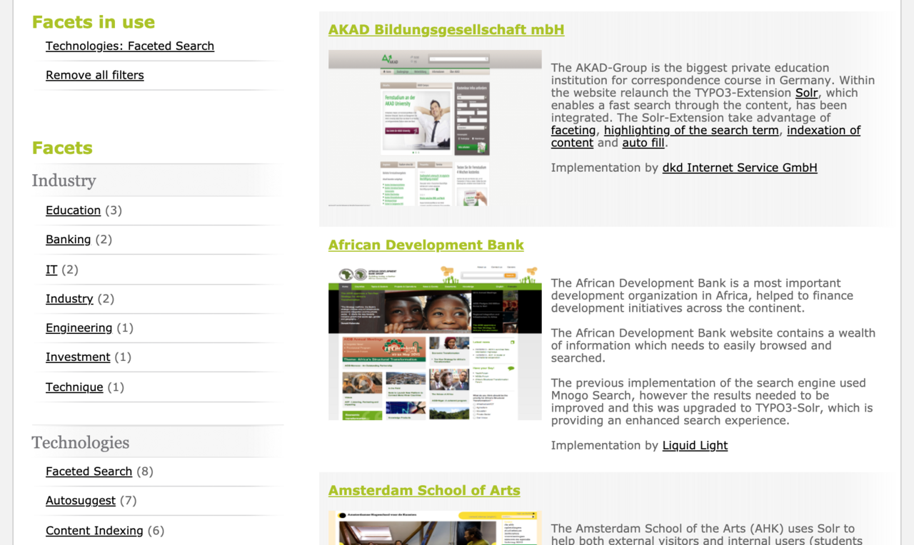 TYPO3’s Apache Solr extension provides faceted search and synonym support. Digital agency dkd shows how the community comes together to support the EXT:Solr extension. Check out the showcase of Solr search in TYPO3 for some inspiration.