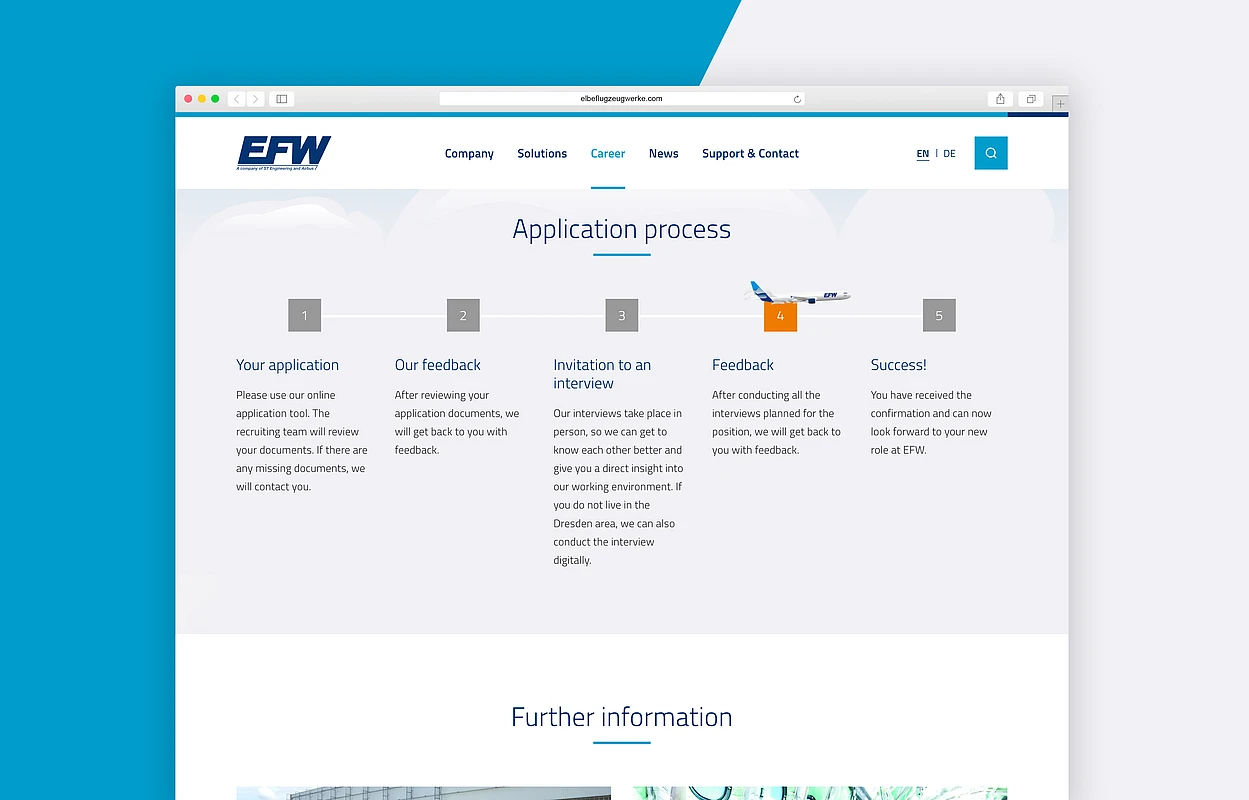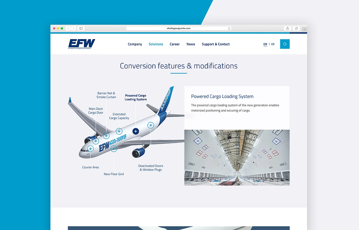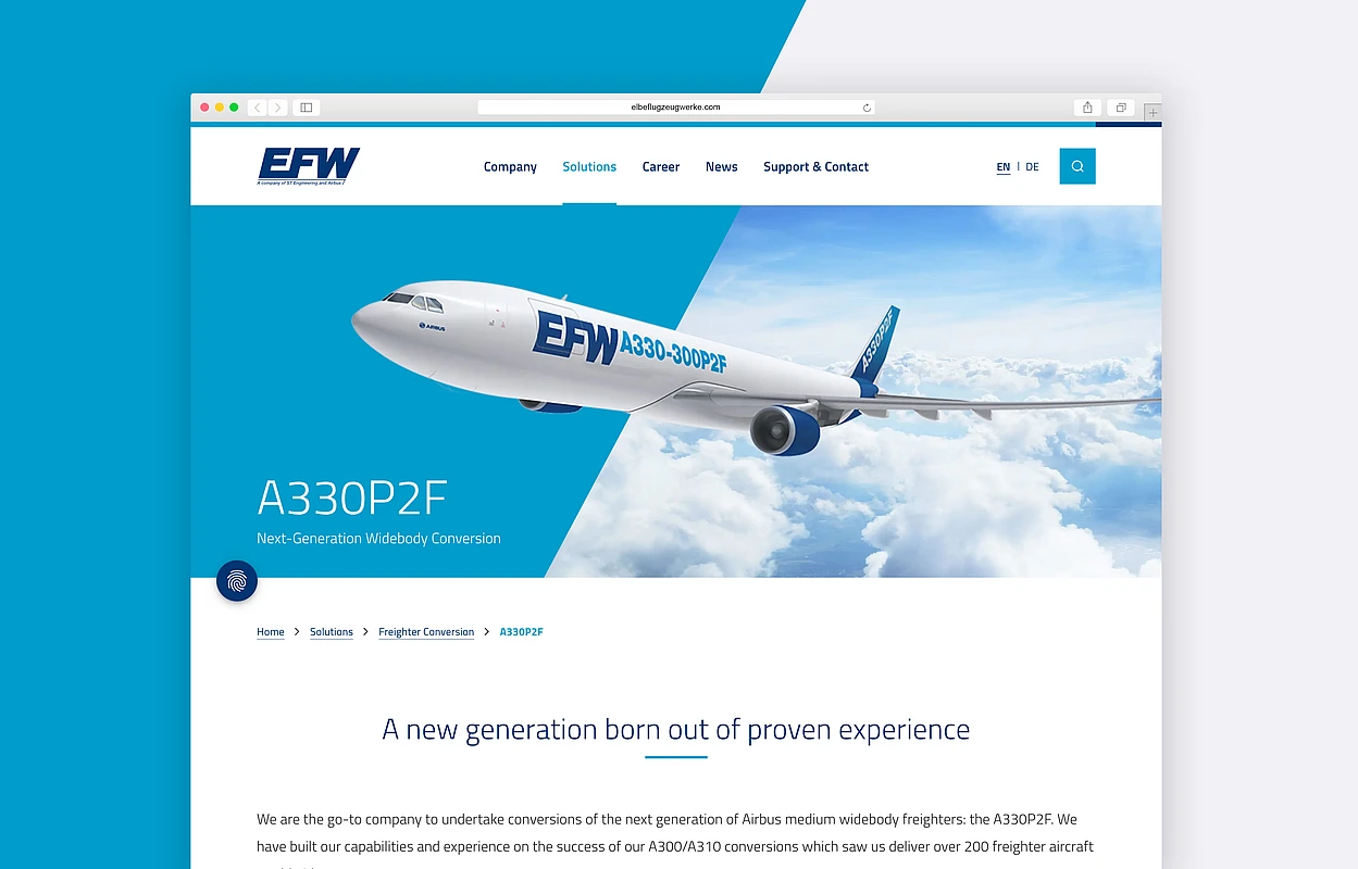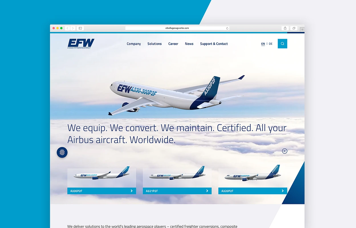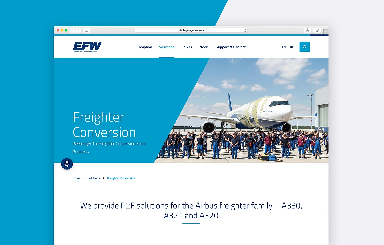 EFW’s previous website was outdated and did not accurately reflect their position as an industry leader. Communication was disjointed and unclear, particularly for job seekers and international audiences. A complete refresh was needed to position EFW’s freighter portfolio (A320P2F, A321P2F and A330P2F) while simultaneously strengthening their presence as an employer. Website usage was increasing significantly which necessitated a complete technical and visual overhaul.