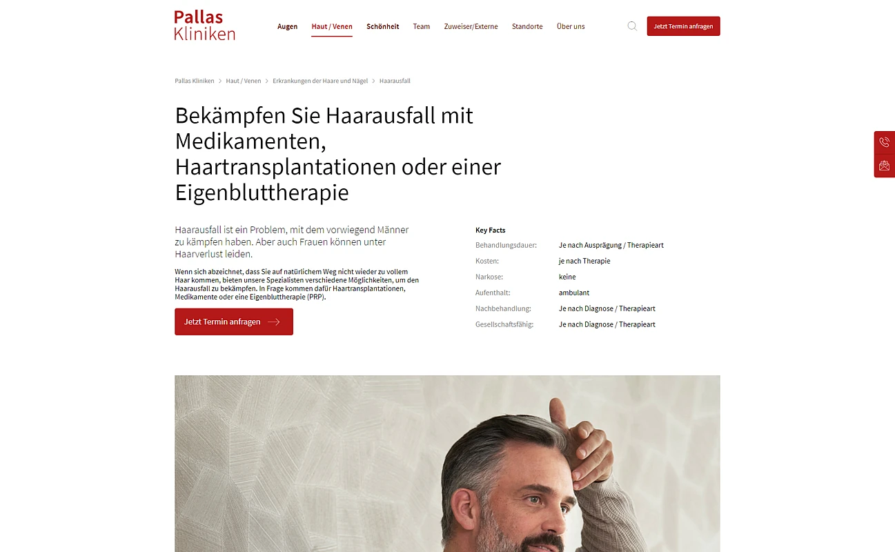 In a sub-project, the task was to implement technical optimisations that an SEO agency had analysed as ranking-improving factors. In addition to improving the usability of the website, the main goal was to ensure that users searching for different treatments on the Internet would find the Pallas offer in a targeted manner.