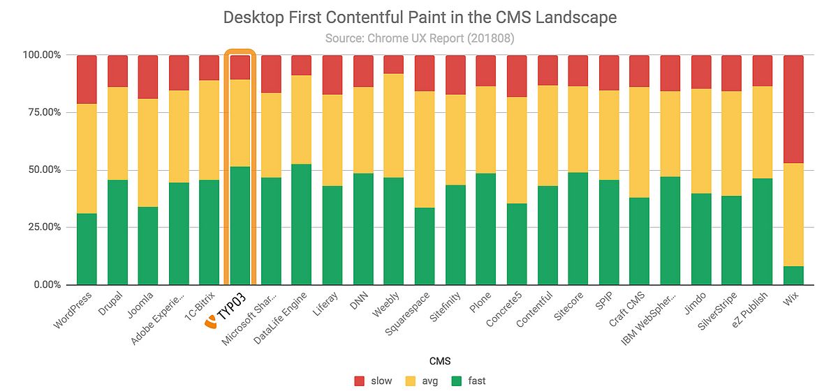 Desktop First Contentful Paint in the CMS Landscape. Source: CMS Performance Analysis (August 2018, link); Artwork: TYPO3 GmbH