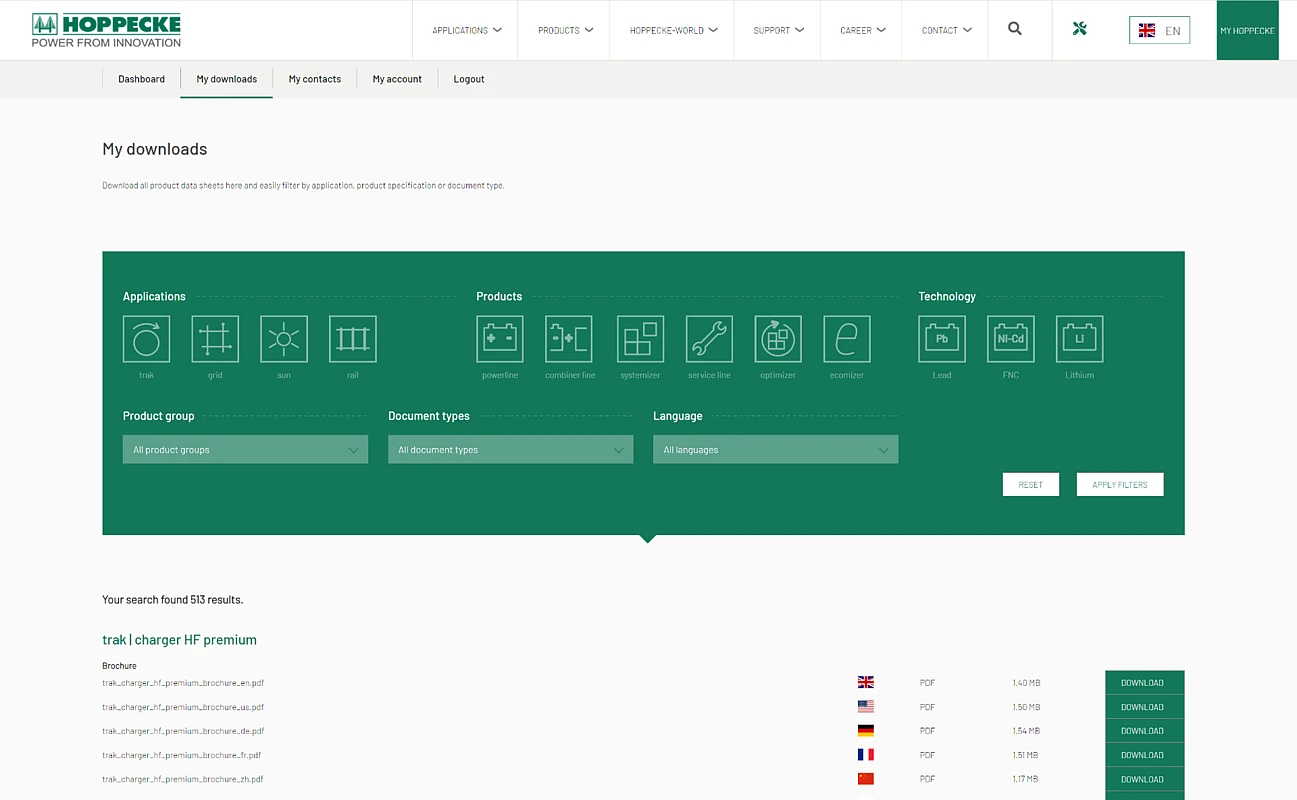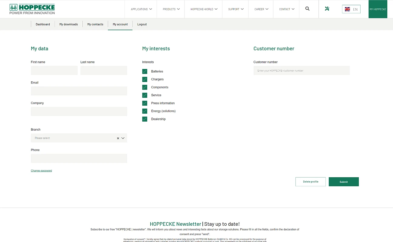 The primary goal of the project was to support Hoppecke’s global operations through the creation of a multilingual platform that would feature improved automation of processes between HOPPECKE and its customers, which means e.g. the reduction of manual processes. The cornerstone of this project would be the integration of several third party solutions such as Azure for secure and effective management of customer profiles, along with providing a central platform for accessing important documents and improving the overall document management process through the use of Pimcore and its categorized document delivery.