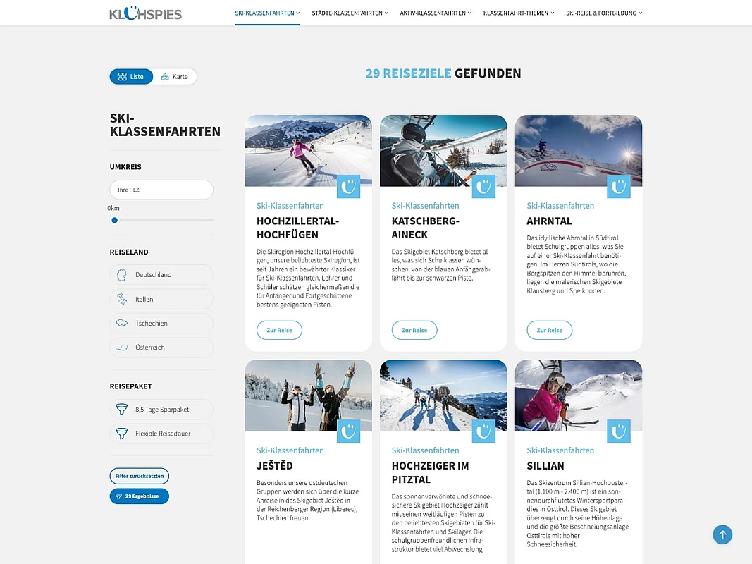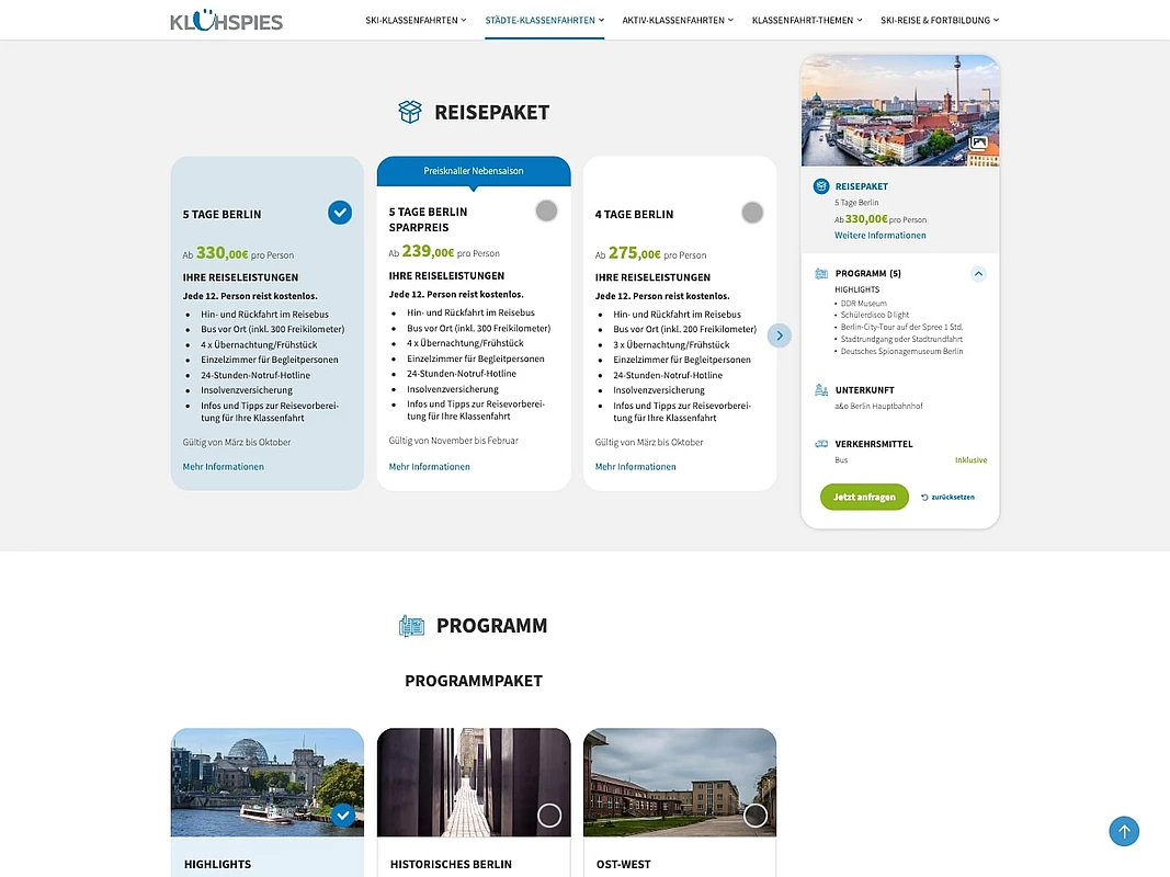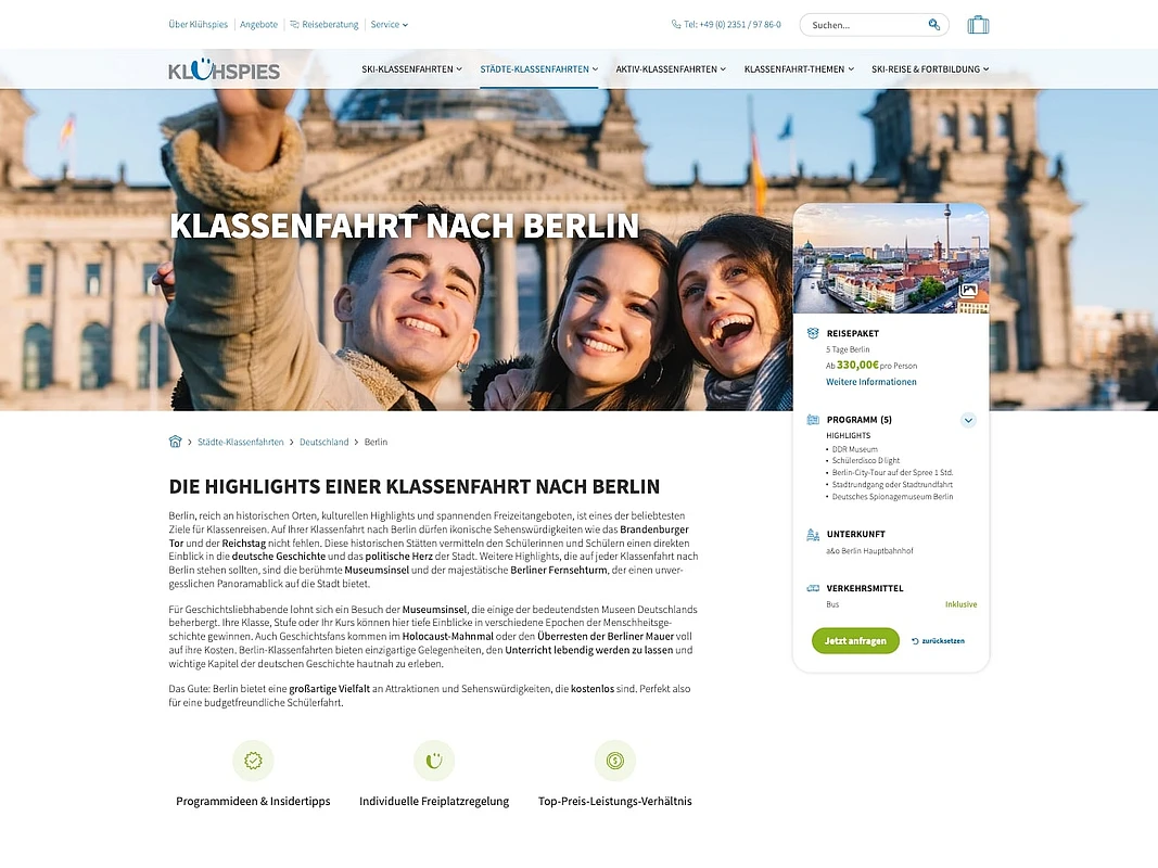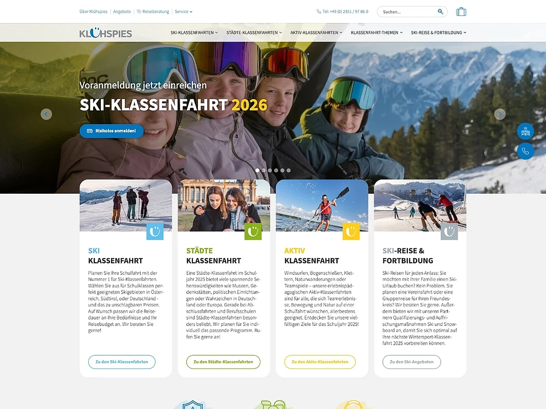 Klühspies is one of Germany’s largest providers of school trips and group travel packages. The travel company aims to present its wide range of travel offerings in a clear and target-group-oriented way through a modernized, user-friendly online presence.