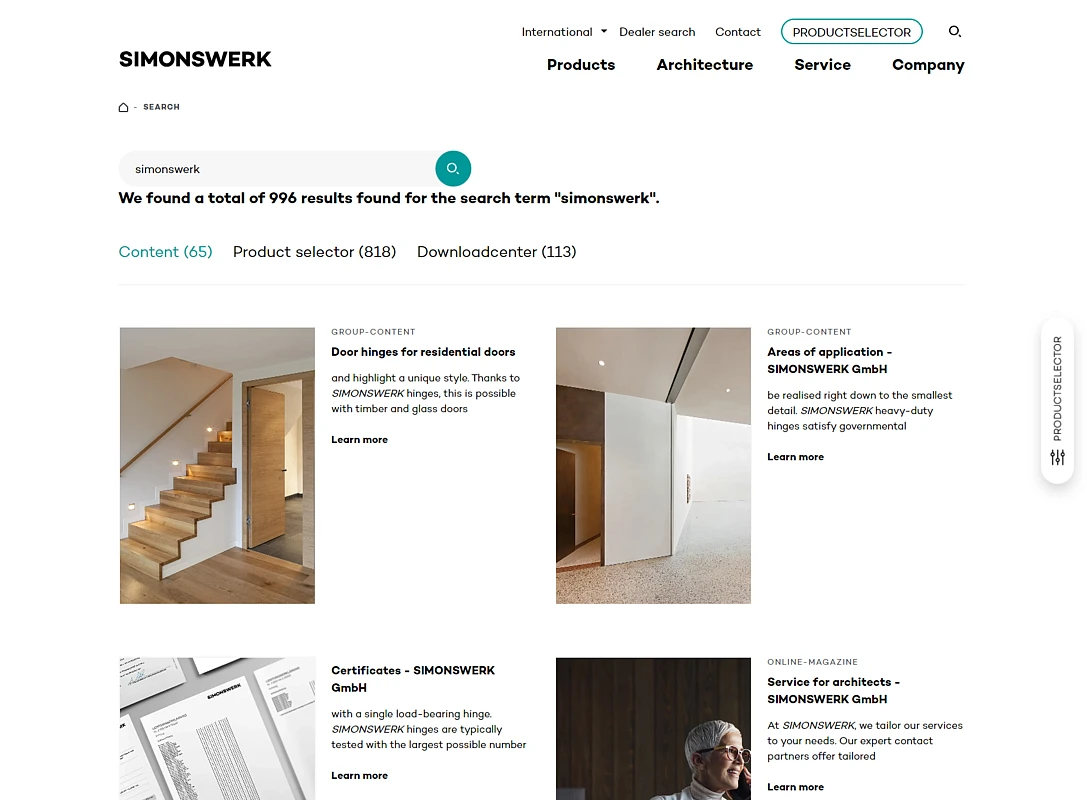 ElasticSearch integration boosted the website’s search functionality. The integration works by indexing the content on SIMONSWERK’s site to make it easily retrievable, even when dealing with large volumes of data. The outcome is faster and more accurate results, which are essential for user retention and satisfaction.