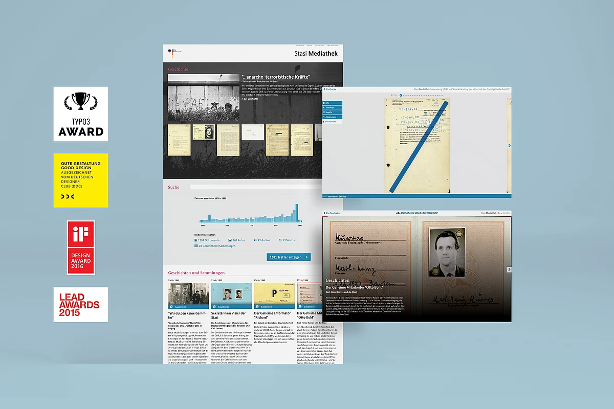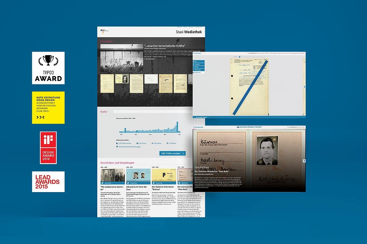 3pc collaborated closely with Stasi-Unterlagen-Archiv archivists to craft intuitive research tools, i.e. ddr-im-blick.de and stasi-mediathek.de, tailored to public needs. Whether a website visitor is in Germany, the USA, or any of the 107 countries where inquiries have come from, accessing the digitized archive inventory consisting of photos, videos, and documents from East Germany’s past directly on the website is now uncomplicated.