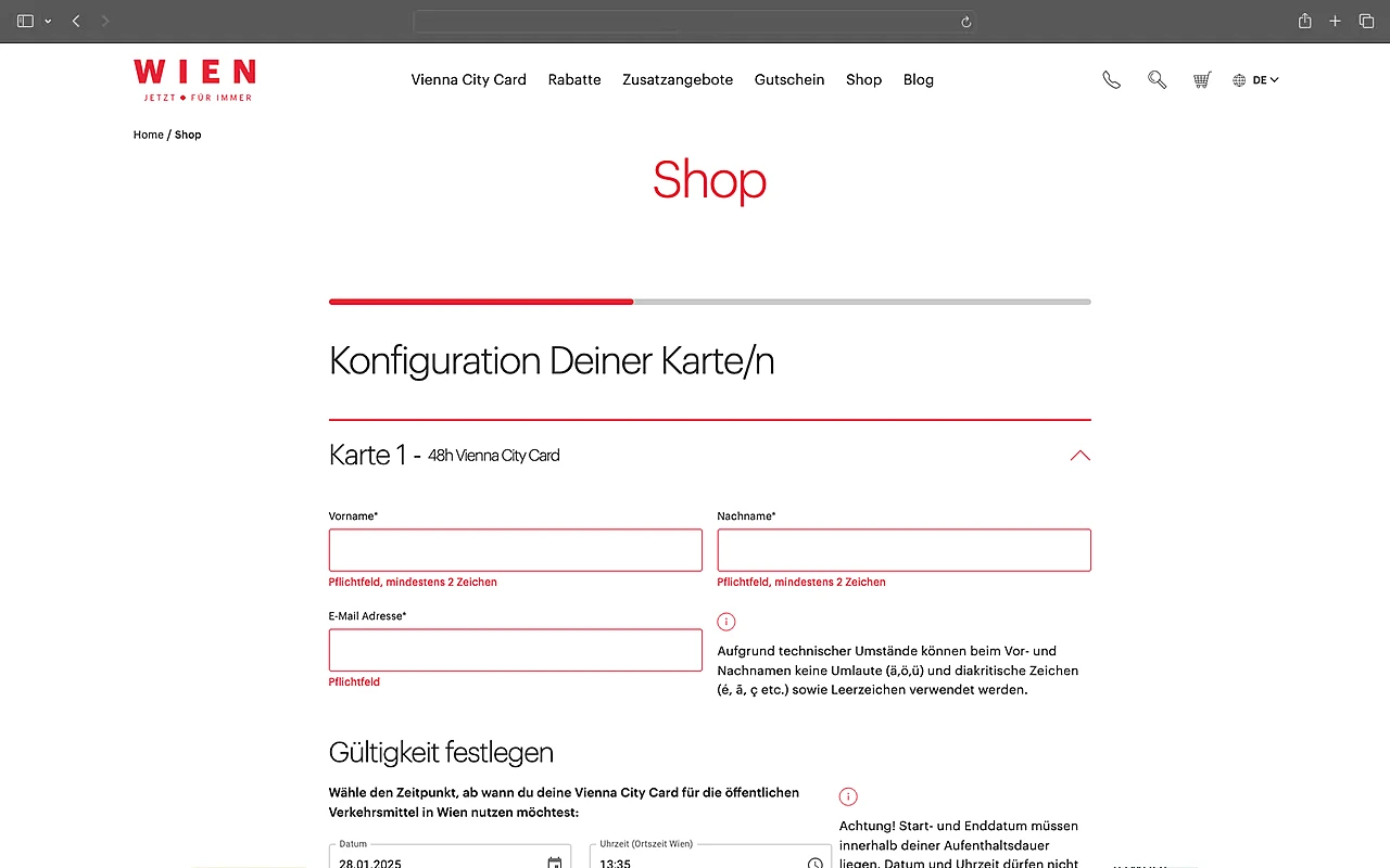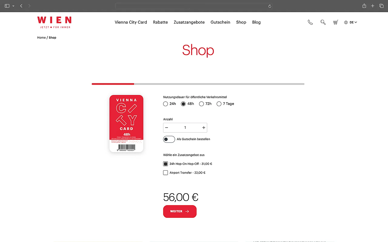 As of November 2024, the Vienna Tourist Board celebrated 7 million Vienna City Cards purchased. With a high volume site reporting more than one million sessions between June - December 2024, loading times and straightforward purchasing options were a necessity to keep this site quick and functional. With a focus on user experience, the shop is straightforward and uncomplicated.The website is available in five languages including German, English, Spanish, Italian and French.