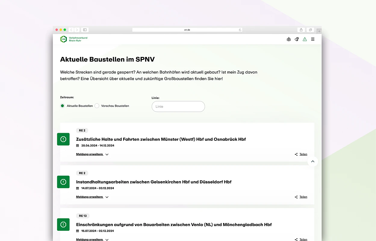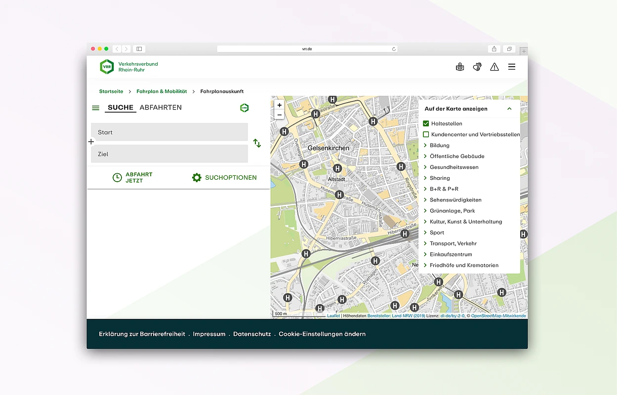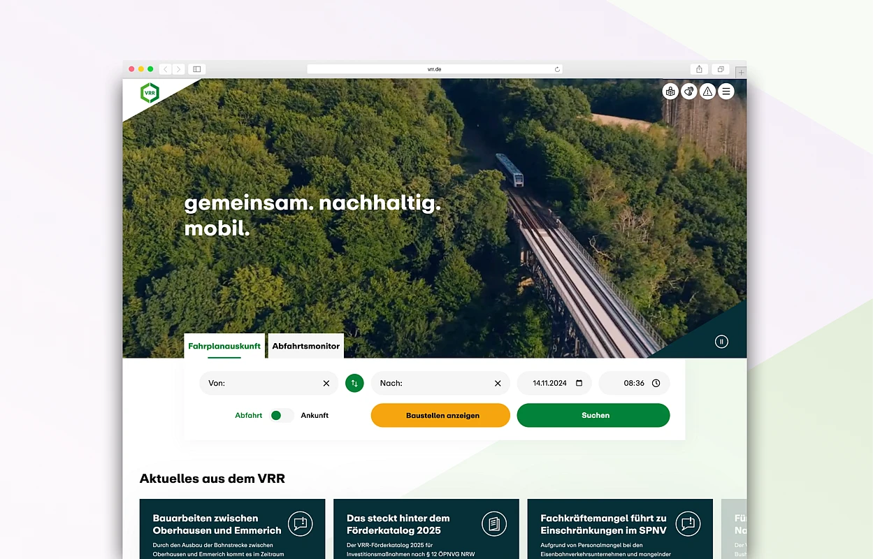 With the foremost goal being providing quick and easy access to relevant content for primary target groups, webit! led the integration of public transportation information systems as central, interactive elements on the VRR homepage.