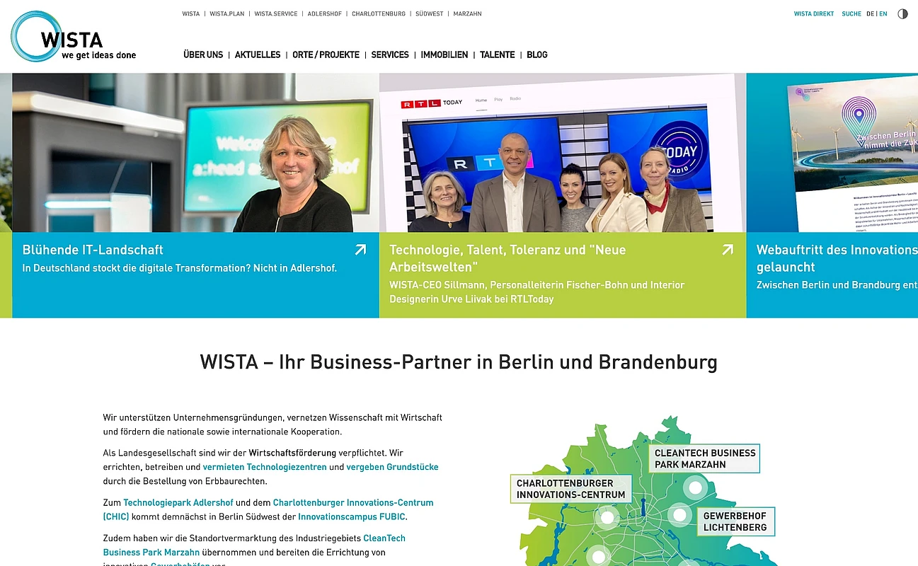 Die WISTA Management GmbH ist ein landeseigenes Unternehmen in Berlin, das sich auf Wirtschaftsförderung und Standortentwicklung spezialisiert hat. Das Unternehmen managt und berät eine Vielzahl von zukunftsorientierten Technologieprojekten und -standorten in den Bereichen Innovation und Green Tech und bildet mit seinen über die Hauptstadt verteilten Technologie- und Forschungsstandorten das größte Technologiecluster Deutschlands.