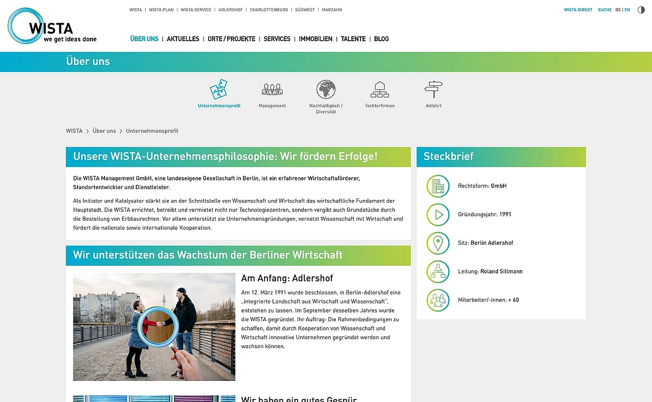 Die Besucher profitieren von einer leichter zugänglichen Website durch das optimierte Frontend, und die Redakteure sind in der Lage, Inhalte im gesamten digitalen Raum von WISTA effektiv zu verwalten und bereitzustellen.