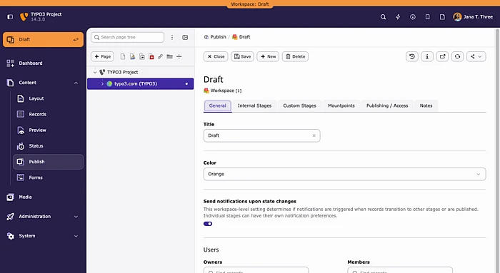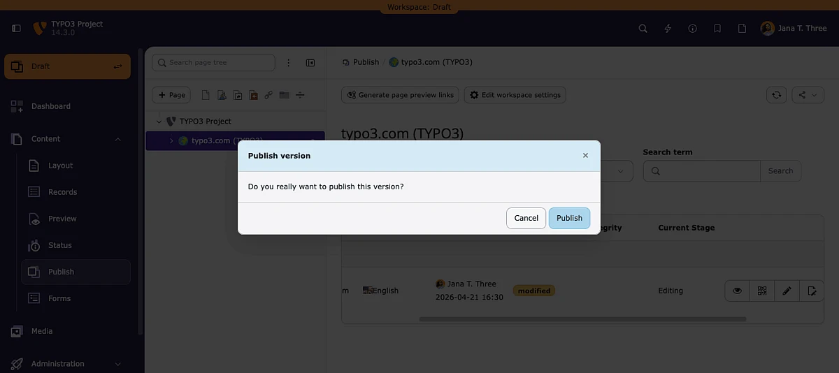 Workspaces sind das in TYPO3 integrierte System zur Überprüfung und Veröffentlichung von Inhalten. Redakteure und Userinnen können Inhalte vorbereiten, in der Vorschau anzeigen und freigeben, bevor sie live gehen – wobei jeder Schritt protokolliert wird und reversibel ist.