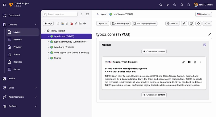 Sobald die Verantwortlichkeiten klar definiert sind, können Teams ihren Teil der Installation selbst verwalten, ohne sich auf einen einzigen Super-Admin verlassen zu müssen. Mit TYPO3 können Fakultäten, Abteilungen, Referate oder regionale Teams ihre Inhalte unabhängig voneinander verwalten – mit Redakteurinnen, lokalen Administratoren und Publishern, die innerhalb klar definierter Grenzen arbeiten.