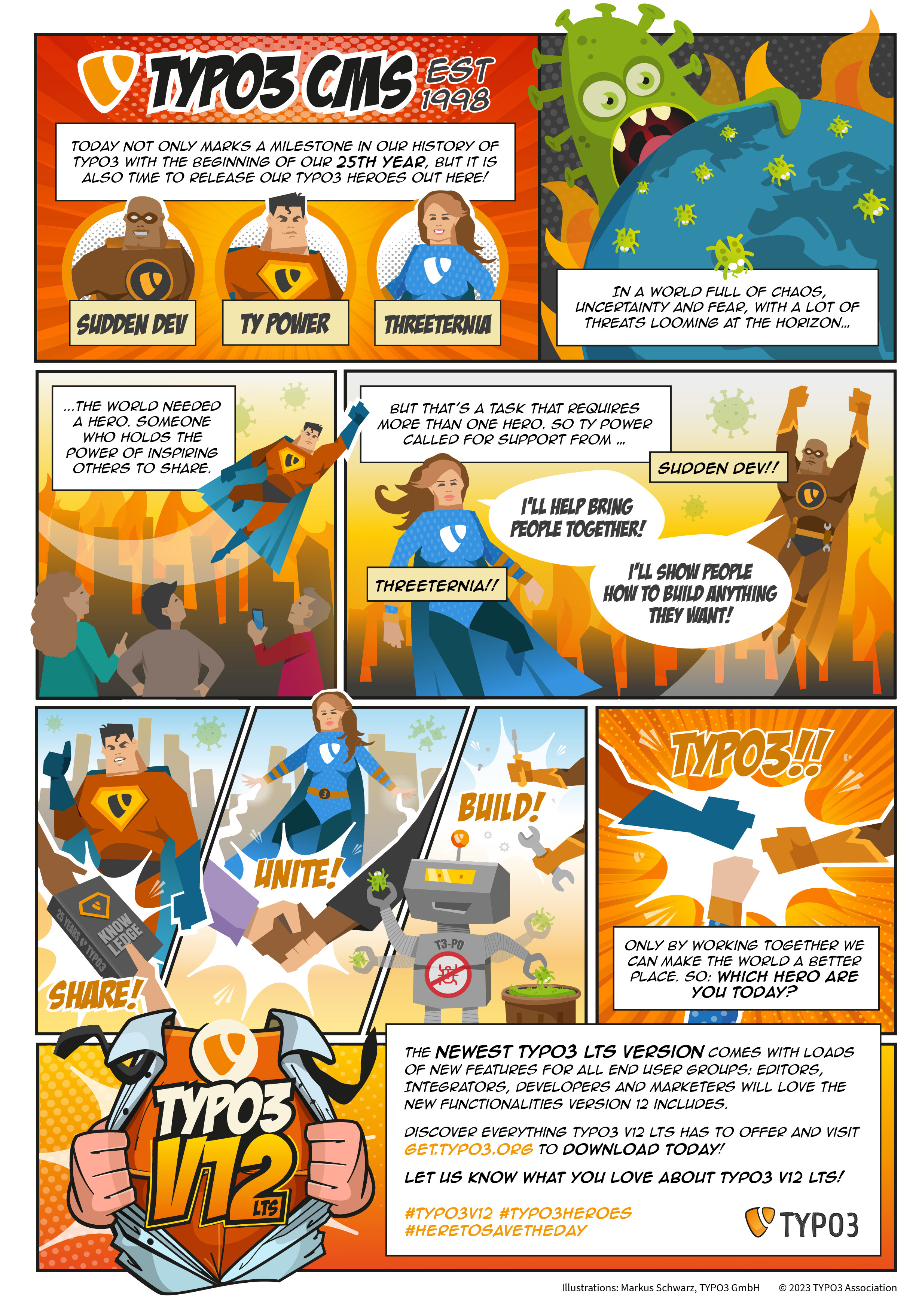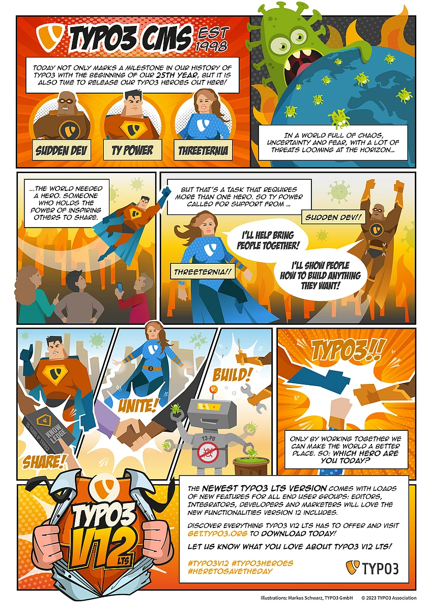 Try out the newest TYPO3 v12 LTS today and share your experiences using the hashtags #TYPO3v12,#TYPO3Heroes and #HereToSaveTheDay. Also don't forget to tag us in your posts!