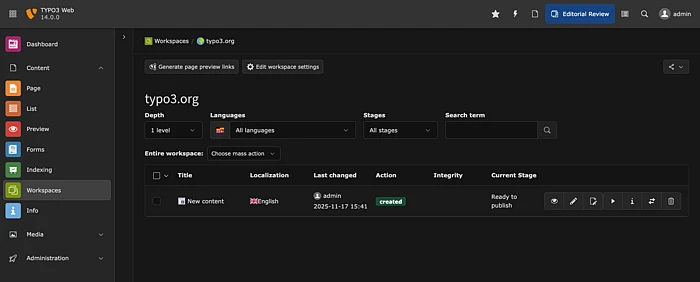 Workspaces are TYPO3’s built-in system for reviewing and publishing content. Editors can prepare, preview, and approve content before it goes live — with every step logged and reversible.