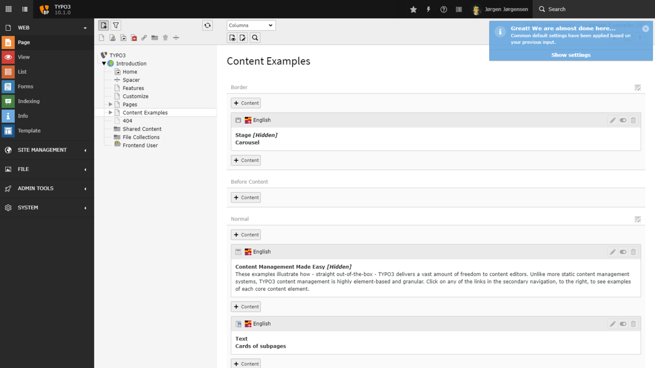 The TYPO3 CMS user experience includes initial site configuration, site maintenance, and content creation. These are just a few of the features which have seen user experience improvements in TYPO3 v10.