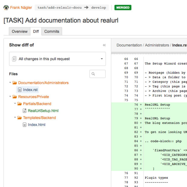 After creating the pull request the feature has to be reviewed by at least one TYPO3 GmbH member as well as having at least one successful build on our continuous integration server (bamboo.typo3.com). You can significantly increase the chance of acceptance for your patch by adding unit tests to your feature.