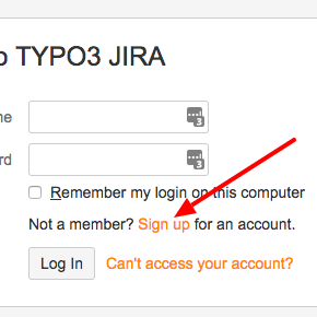 Sign up for an account at jira.typo3.com - just click the sign up link on the login form. Choose an email address (ideally the one that you will use for git, too) and fill in your name. After registration you should be logged into JIRA (where you can create issues and keep track of them).