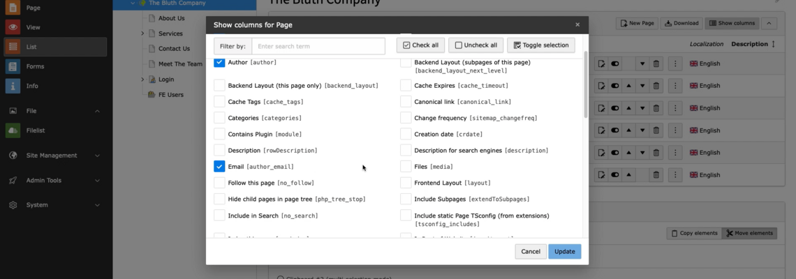 As an example, we’ll walk you through the process of finding out who the author and email address is for each page. Prior to v13, you would need to edit each page in order to access or view its individual properties. With this new mass editing columns feature, it’s now possible to view any number of pages and select what information you’d like to see for multiple pages.