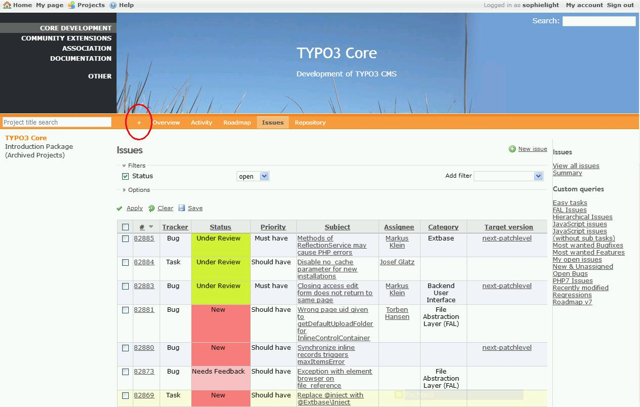 Your next is to go to our issue tracking system. We use TYPO3 Forge for tracking. Sign into the system with the username and password you saved at typo3.org.