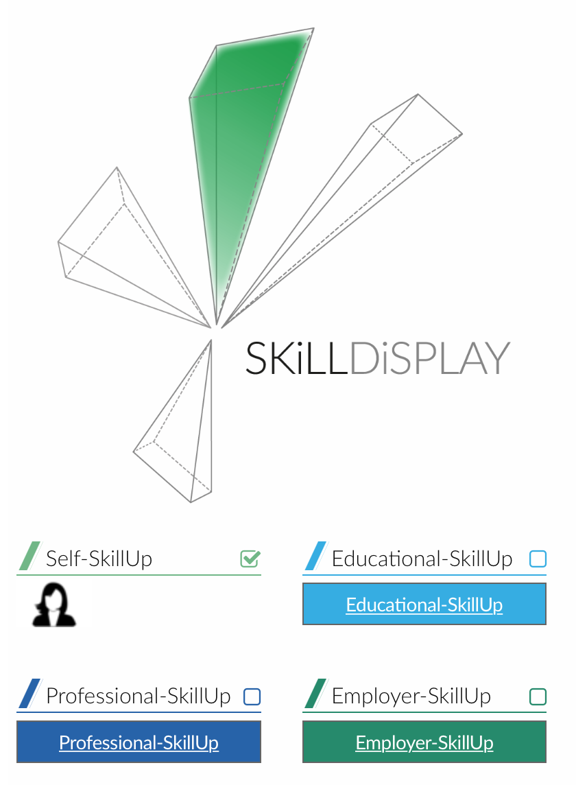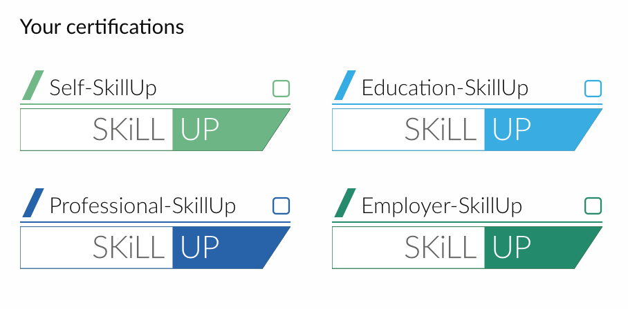 As soon as you are convinced that you have achieved the skill you can click on the Self-SkillUp button. This will help you to see which skills you have already earned and which ones you still have to learn. It may also motivate you to see that the SkillDisplay logo and the progress bar will be filled more and more with every new skill you get.(See images below.) - Take the exam