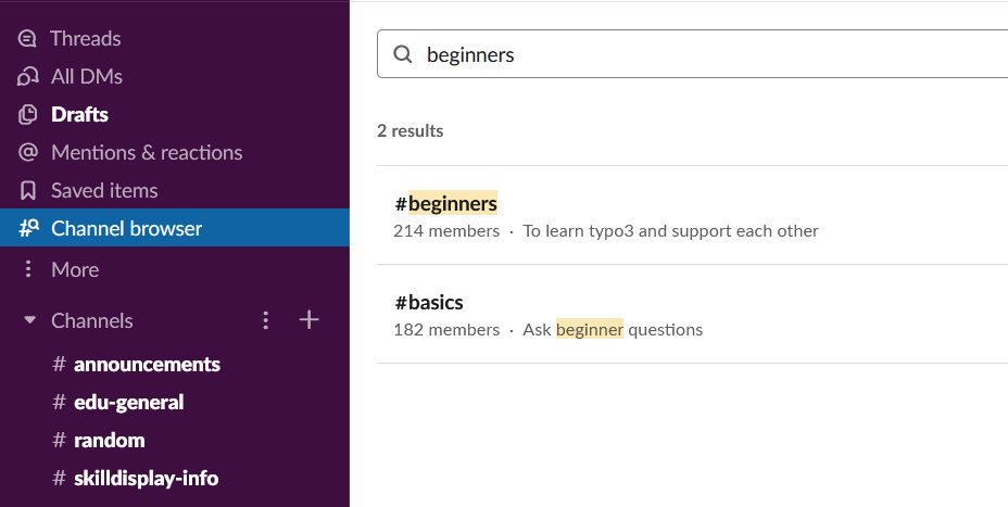 While learning how to use TYPO3, you’ll surely get some questions, so get ready for Slack! You can find a guide on how to join the TYPO3 slack channel here. You can then join the channels for beginners - either press the ‘+’- symbol next to the channels or the More button to find “Channel browser” or “Browse channels”.