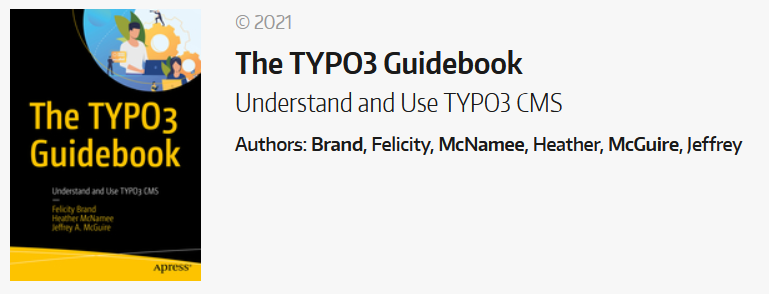 Another resource, which will be published in the beginning of 2021, is the TYPO3 guidebook! The book is like a tour guide. It tells you what sights you can visit, but it is up to you to explore the city. Likewise, you should also apply the newly gained knowledge instead of only reading about it.
