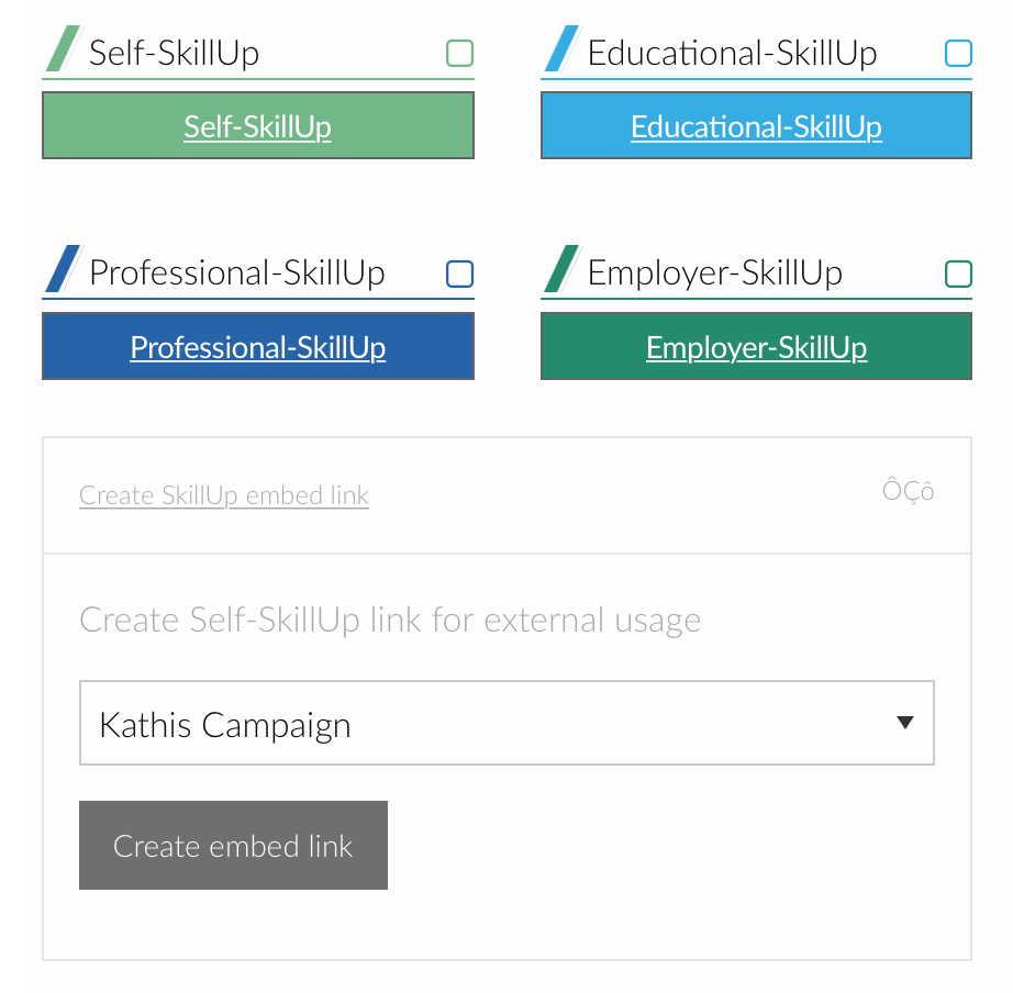 To embed a SkillUp-Button you have to contact the SkillDisplay team. You’ll then get part of a campaign and accordingly have the possibility to generate a link at each single view of a skill. Now you can create a button with this link on your website so others have the ability to give themselves a SkillUp when they visit it.