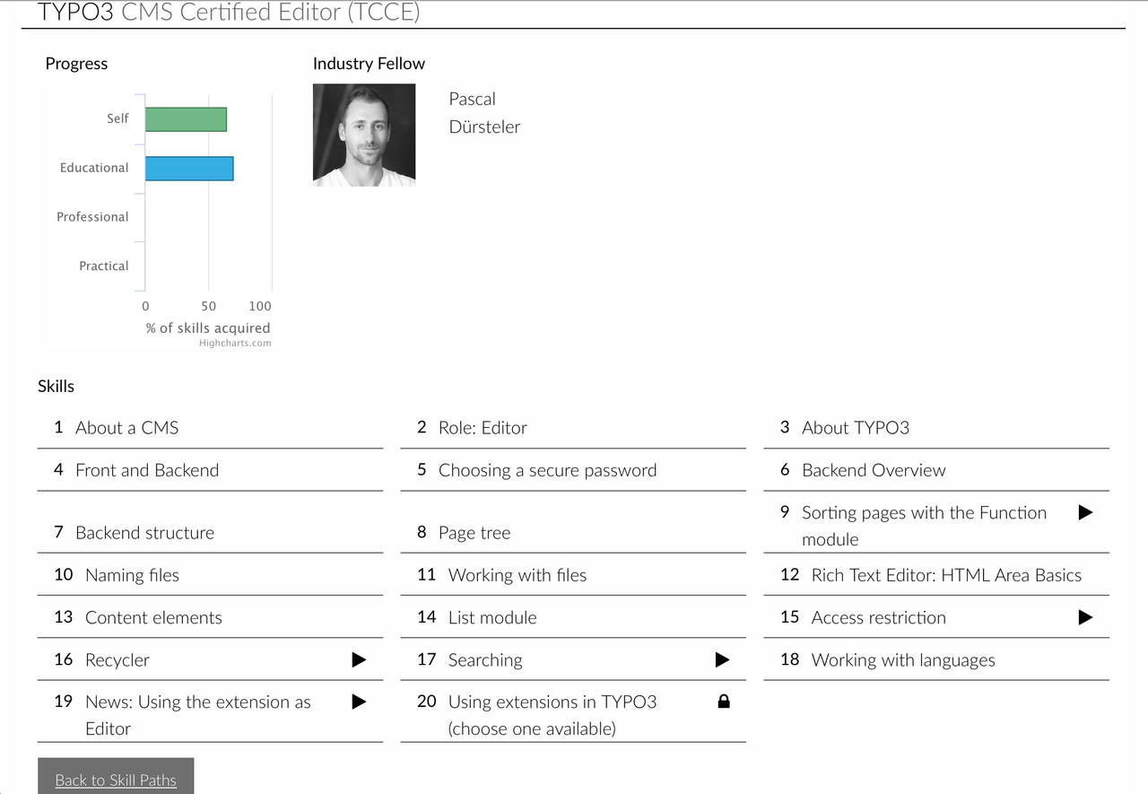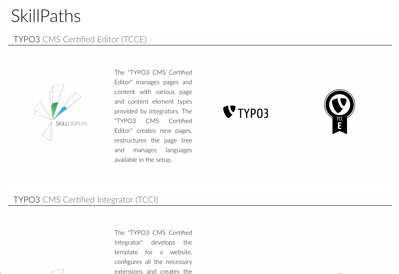 SkillDisplay provides some pre-built learning paths for TYPO3 users like “TYPO3 CMS Certified Editor (TCCE)”, “TYPO3 CMS Certified Integrator (TCCI)”, “TYPO3 FLUID Basics: Standalone” and “TYPO3 FLUID Basics: TYPO3 Edition”. These should help you improving your TYPO3 skills and for those who like to proof their abilities it helps preparing for some certificates.