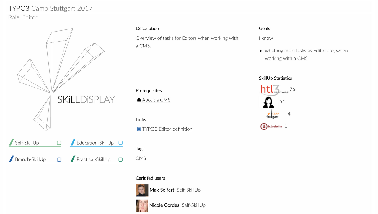 SkillDisplay uses the same concept to make your learning experience as rich and fun as possible. Let’s say you want to attain the skill “Role: Editor”. How would you be able to understand what an editor is supposed to do, if you didn’t have a clue as to what a CMS is? It is just not possible. If you do not know whata content management system is, you cannot know what the editor does. Hence the “About a CMS” skill is an essential prerequisite for attaining the SelfSkillUp-Button “Role: Editor”.