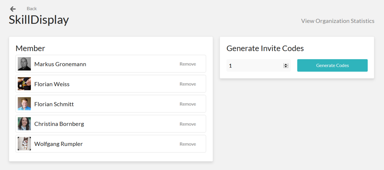 By pressing the view button of the organisation you are an administrator of, you can access the overview. Invitation codes can be generated and an overview of which members are currently part of the organisation is available, with more functions to follow in the future. In the top right, you can see the “View Organisation Statistics” button.