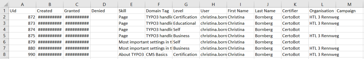 To get a greater detail about all skills verified by your members, as well as all skills your members verified for somebody else (business or educational verification; only with specific rights, provided by SkillDisplay, possible), a CSV can be downloaded containing all that information, which can be used for independent analysis.