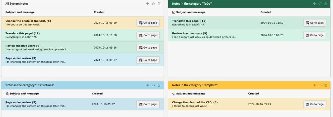 With TYPO3 v13, the System Notes extension received a considerable upgrade with the introduction of new UI elements and a brand new System Notes Dashboard.