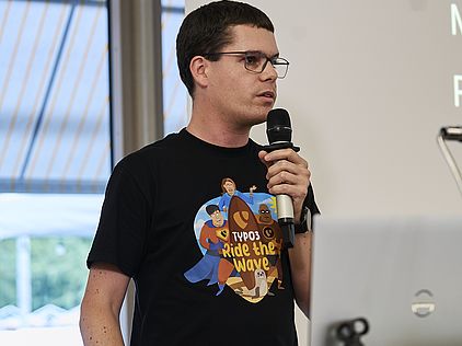 On Thursday the day started with breakfast at the hotel, which was decorated in the TYPO3 surf theme from the entrance, to the event branding, and the Surf Simulator available for playing. Breakfast was followed by a keynote from Benni Mack, TYPO3 Project Lead and b13 CTO, where he set the tone for the days to come with an interesting deep-dive into AI and how it can be a tool to support continued development of TYPO3 and open source technologies.