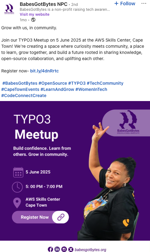Für BabesGotBytes war TYPO3 die ideale Lösung, da es sich auf die Community konzentriert, Neuankömmlinge willkommen heißt und einsteigerfreundlich ist. Seitdem engagieren sich Phindiwe und BabesGotBytes auf verschiedene Weise in der TYPO3-Community. Sie veranstalten regelmäßig TYPO3-Meetups in Kapstadt, bei denen die Teilnehmenden die Möglichkeit haben, sich mit der TYPO3-Community und dem CMS vertraut zu machen. Diese Treffen beinhalten auch praktische Übungen zur Open-Source-Zusammenarbeit, bei denen die Teilnehmerinnen lernen können, wie sie zur Dokumentation von TYPO3 beitragen und die Zukunft der Plattform aktiv gestalten können.