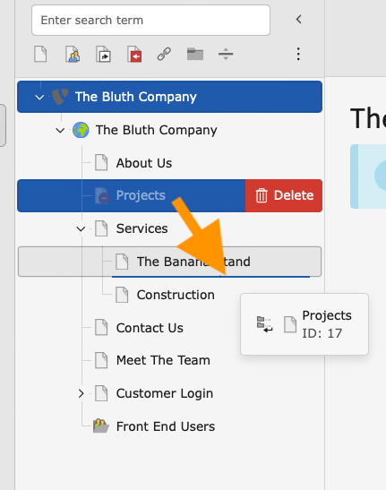Der Seitenbaum ist eine hierarchische Liste aller Seiten unserer Website. Der Seitenbaum dient auch als eine Art Container für Elemente wie News-Stories, Blog-Einträge und, in diesem Beispiel, Datensätze für Frontend-Benutzer.