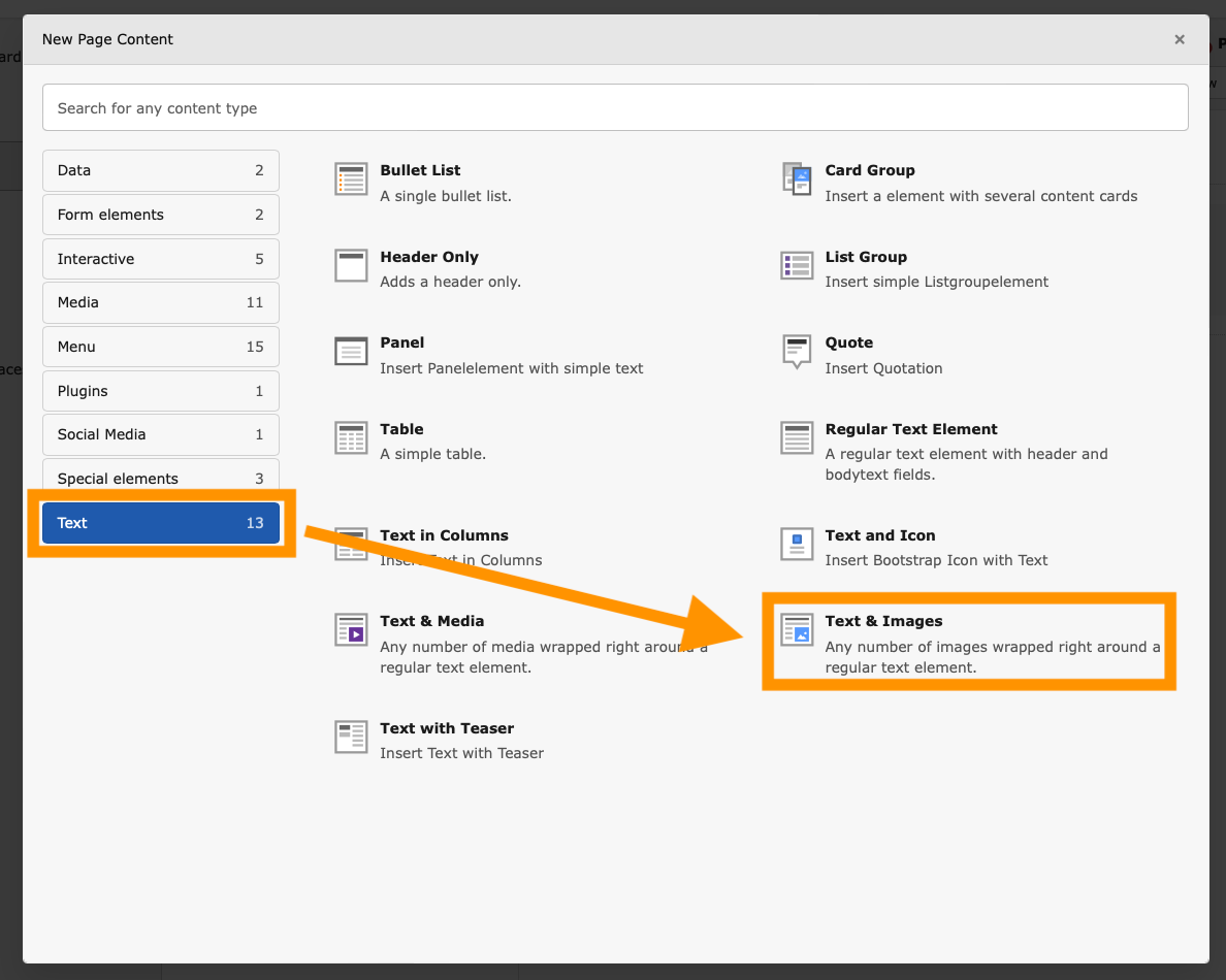 Jede dieser verschiedenen Arten von Inhalten existiert als Contentelement in TYPO3. Und wenn ich meiner neuen Seite Text und Bilder hinzufügen möchte, muss ich das entsprechende Contentelement verwenden.