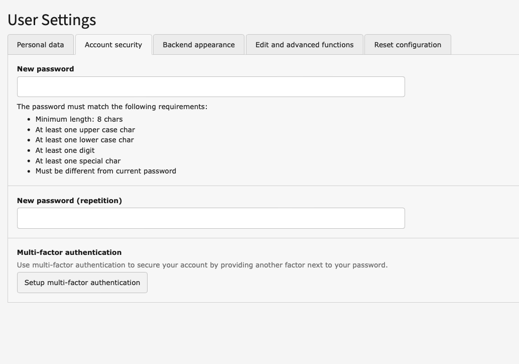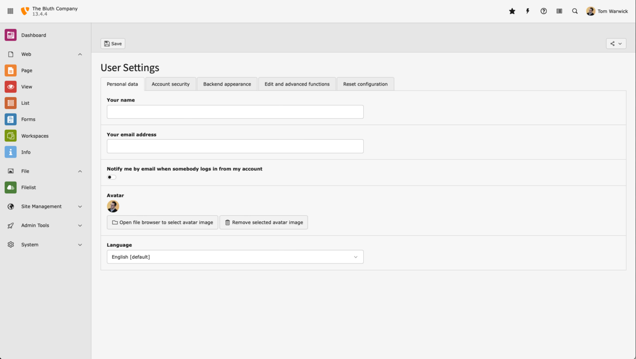 Außerdem kann ich die Sprache des Backends über mein Benutzerprofil anpassen. Meine Installation umfasst zusätzliche Sprachen, sodass ich bei Bedarf einfach die Sprache wechseln und im Backend arbeiten kann.