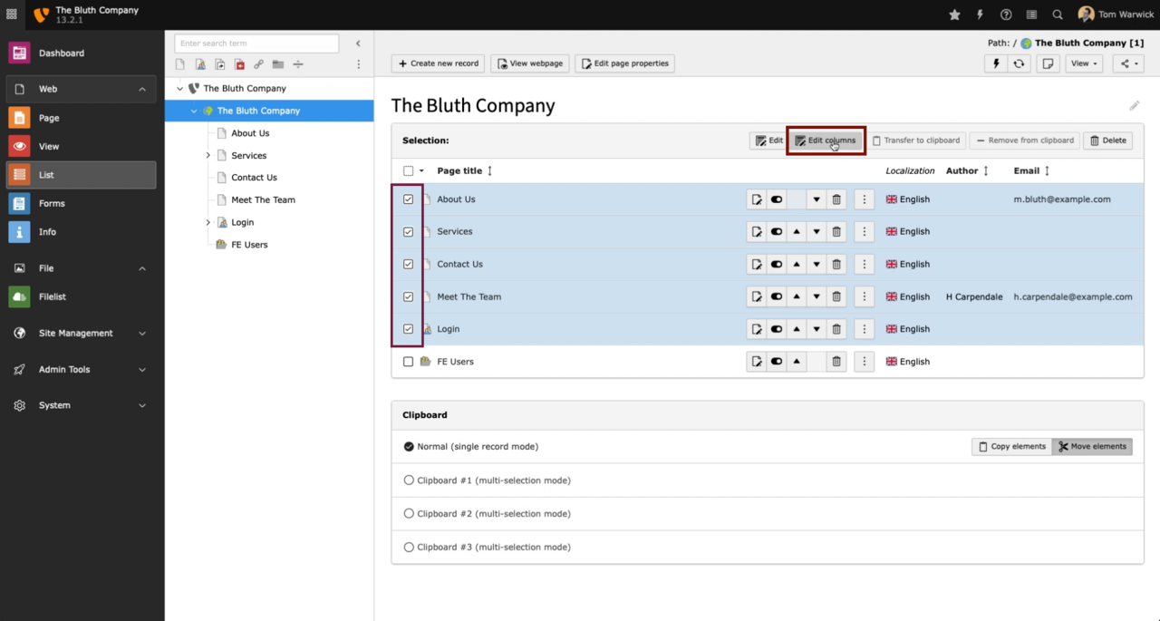 • To set a new author and email address, select the pages you wish to update and then select the edit columns button