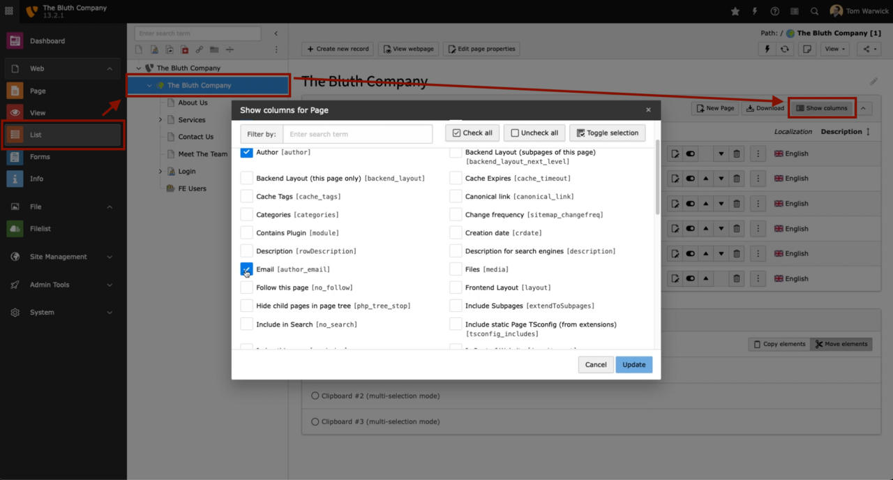 As an example, we’ll walk you through the process of finding out who the author and email address is for each page. Prior to v13, you would need to edit each page in order to access or view its individual properties. With this new mass editing columns feature, it’s now possible to view any number of pages and select what information you’d like to see for multiple pages.