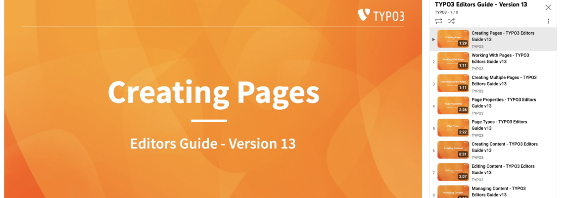 Um Redakteuren aktuelle Ressourcen zur Verfügung zu stellen, haben wir eine eigene Playlist auf dem TYPO3 YouTube-Kanal erstellt. Diese achtteilige Serie deckt alles von der Erstellung von Seiten bis zur Arbeit mit Inhalten ab.