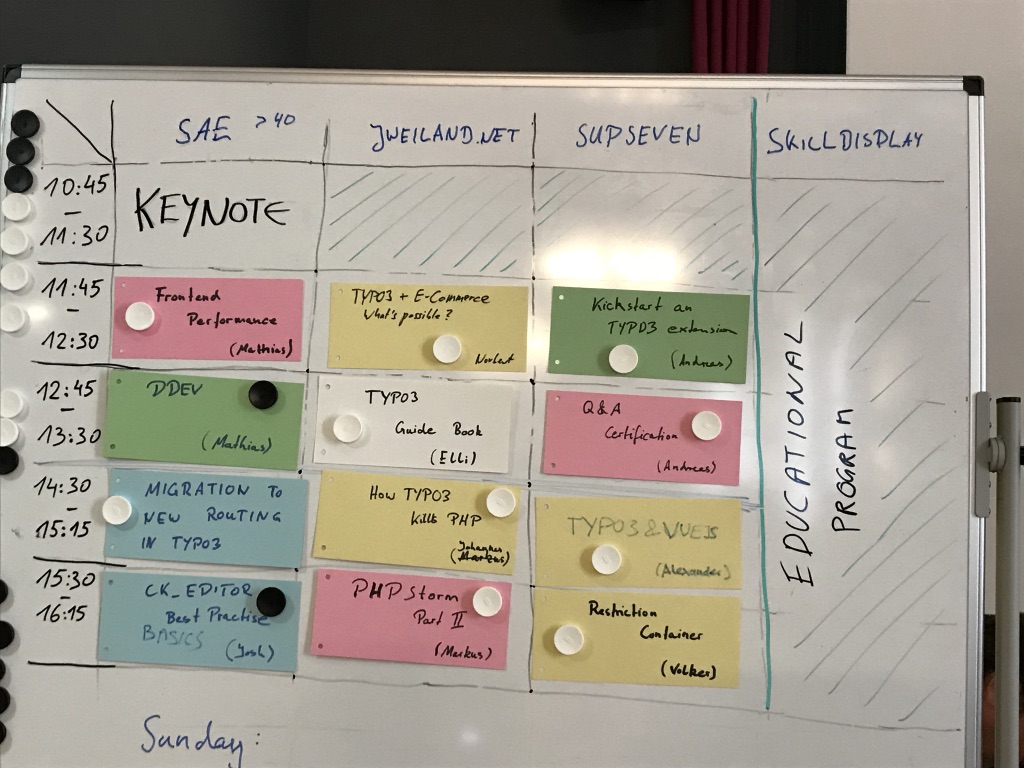 The room of the location sponsor SAE hosted sessions like PHP Storm - Tips and Tricks by Markus Klein (reelworx) and Localisation in TYPO3 v9 by Mathias Schreiber (TYPO3 GmbH). On Sunday, CKEditor Basic Configuration and Learnings and Frontend Performance were part of the session plan.